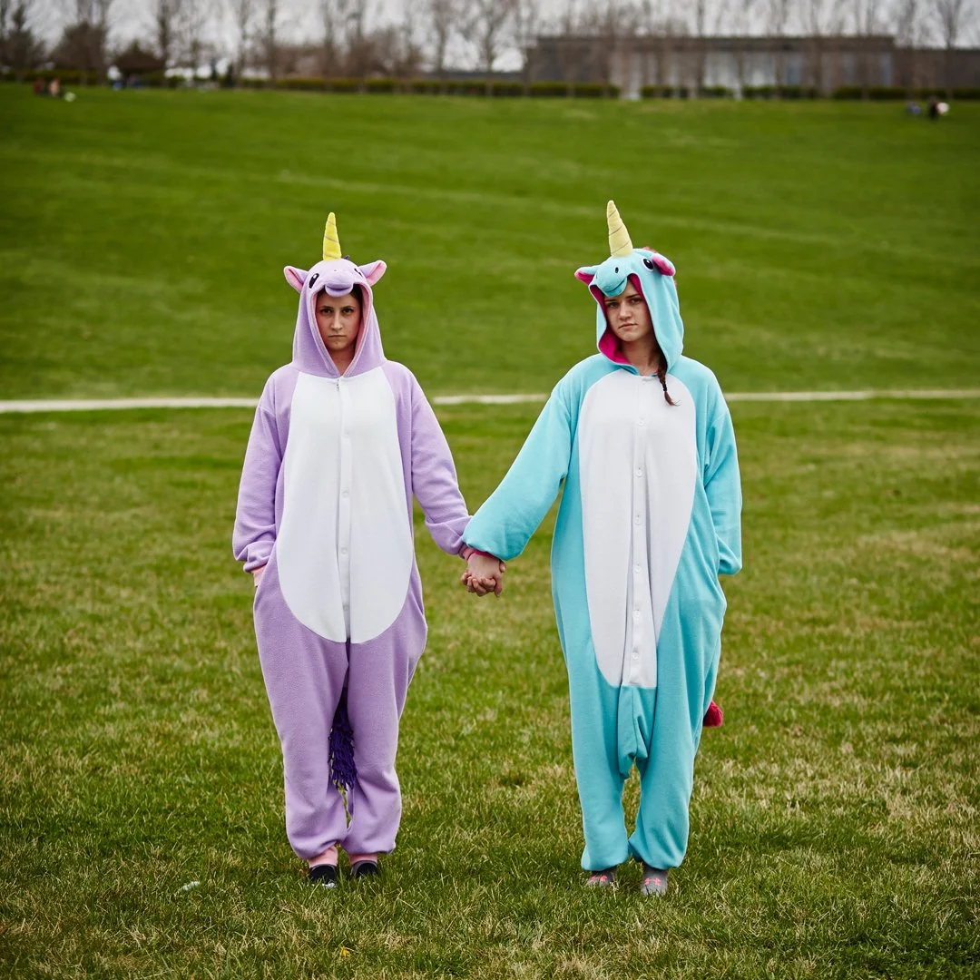 Friends, Mackenzie Sweall (Purple) Lauren Carlson(Teal) enjoy the day in Forest Park.